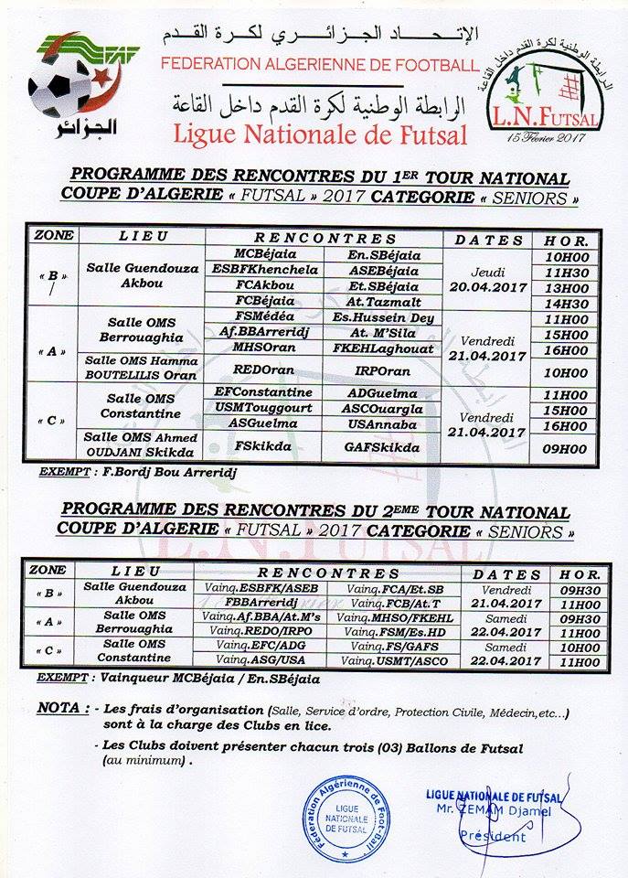 إليكم برنامج منافسات كأس الجمهورية لكرة القدم داخل القاعات والمقرر إجراؤها أيام الخميس ، الجمعة والسبت 20 ، 21 و 22 أفريل 2017