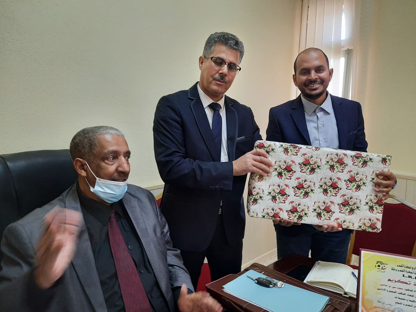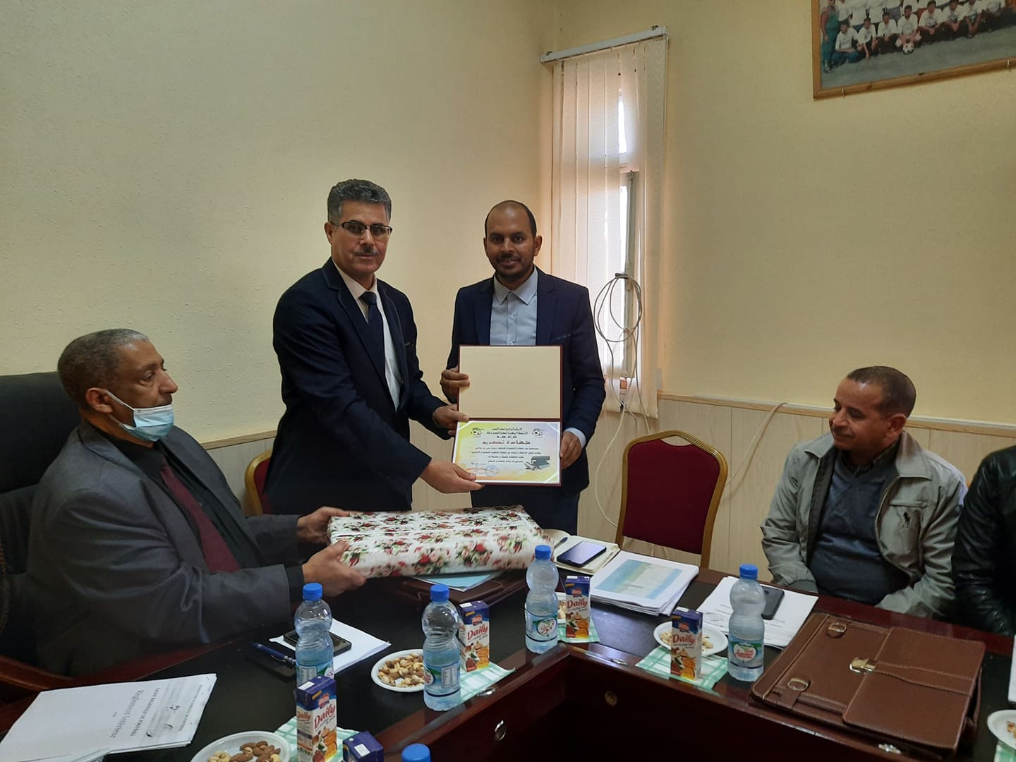 وفي نهاية الاجتماع تم تكريم السيد الدكتور محمد يحي بن ساسي بمناسبة مناقشته ونيله شهادة الدكتوراه في العلوم الاقتصادية جامعة الوادي متمنين له حياة مهنية أفضل.