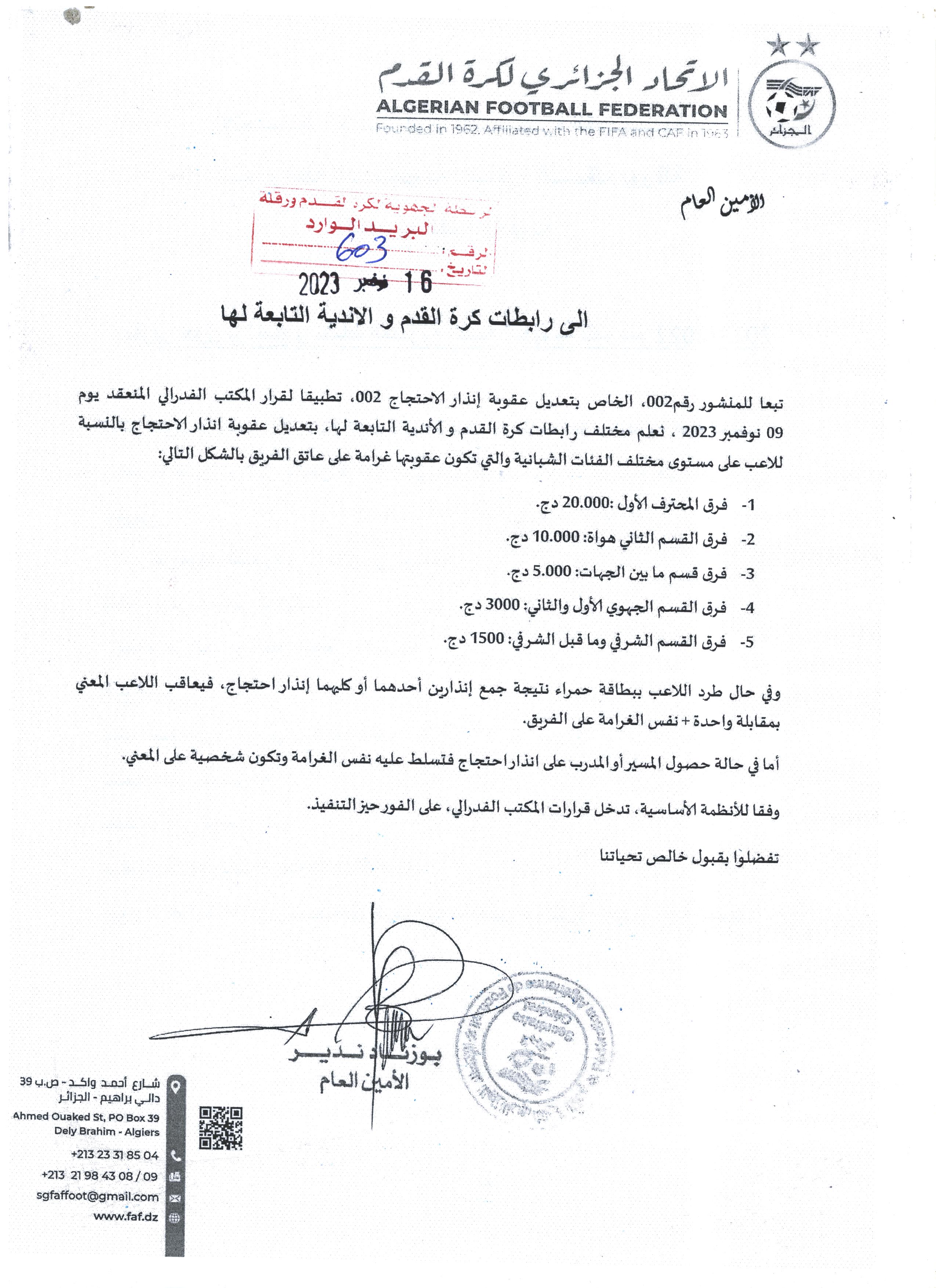 مراسلة الاتحاد الجزائري لكرة القدم بخصوص الانذار بسبب الاحتجاج حسب قرارات المكتب الفدرالي بتاريخ 09 نوفمبر 2023